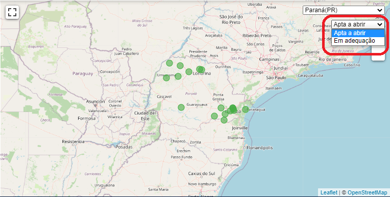 Ao abrir o site Portal Covid, escolha a opção “Mapa das agências abertas”, depois o estado onde reside e na nova tela, escolha novamente o estado ao lado direito superior do mapa e então a “situação” das agências (apta a abrir ou em adequação), conforme abaixo: