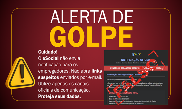 Os empregadores devem estar atentos para as tentativas de golpes recebidas através de e-mails contendo uma suposta notificação do eSocial sobre pendência de atualização cadastral, com a ameaça de suspensão de benefícios dos trabalhadores. É falso!