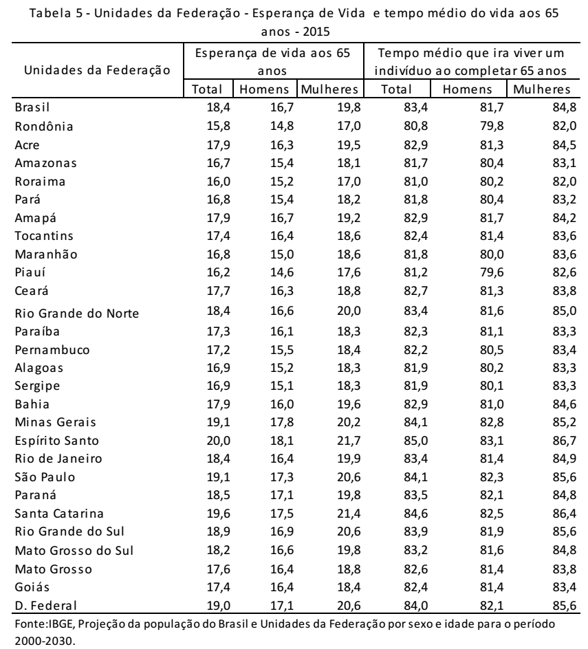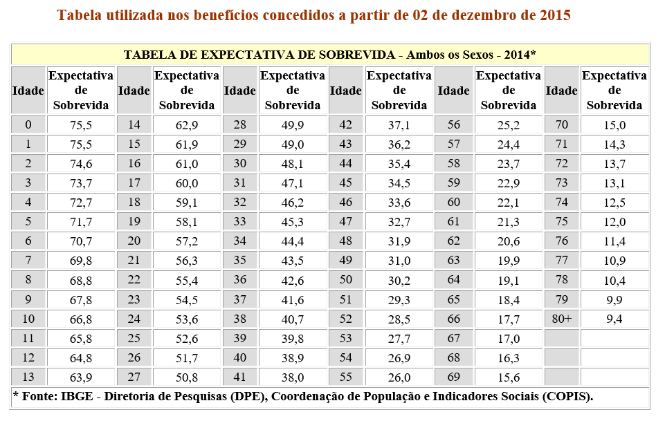 As informações divulgadas nas Tábuas Completas de Mortalidade do Brasil de 2017, com as expectativas de vida para as idades exatas até os 80 anos, foram utilizadas para determinar o Fator Previdenciário, no cálculo das aposentadorias do regime geral de previdência social.
